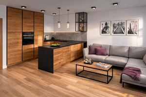 Kuchyň v dekoru dřeva s černou