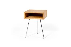 Stolek ke křeslu nebo noční odkládací stolek k posteli, takové využití mohou mít stolky NO. Stolek menších rozměrů na kovové trojnožce v chromovém provedení nebo černém a hnědém komaxitu. Deska stolku v olejovaném dubu.